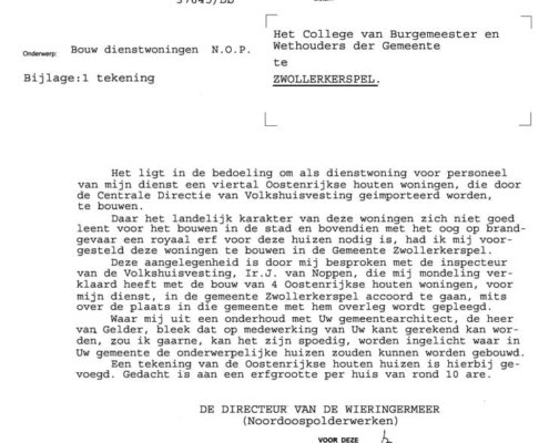 1948 – Behalve over bedrijfsgebouwen dienen de pachters ook over een eigen woning te beschikken en, voor de bedrijven groter dan 21 ha, over een woning voor de vaste arbeider. Van het aanvankelijke voornemen de pachters in de in aanbouw zijnde stenen dubbele arbeiderswoningen te huisvesten, is men teruggkomen, toen de gelegenheid zich voordeed houten, z.g. Oostenrijkse, woningen te plaatsen. Op 73 bedrijven komt nu een dergelijk huis, zodat, wanneer dit bouwplan is voltooid, alle pachters over een eigen woning en zo nodig over een woning voor de vaste arbeider zuilen beschikken. Inmiddels is wel gebleken, dat het verpachten van bedrijven, waarop de noodzakelijke gebouwen nog niet staan, vele moeilijkheden medebrengt, zowel voor de Directie als voor de pachters.
