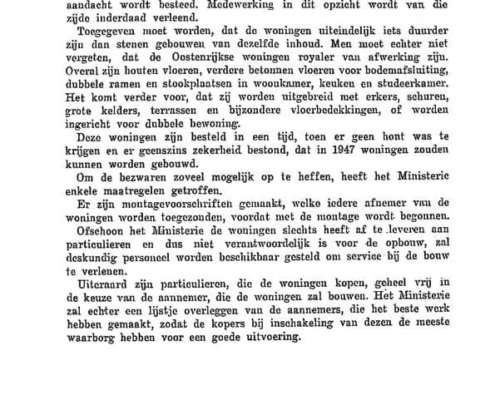 De woningen kunnen, wanneer zij goed worden onderhouden, vele jaren mee en zijn dus als permanente woningen te beschouwen. De eerste zending kan medio December 1946 worden tegemoet gezien.