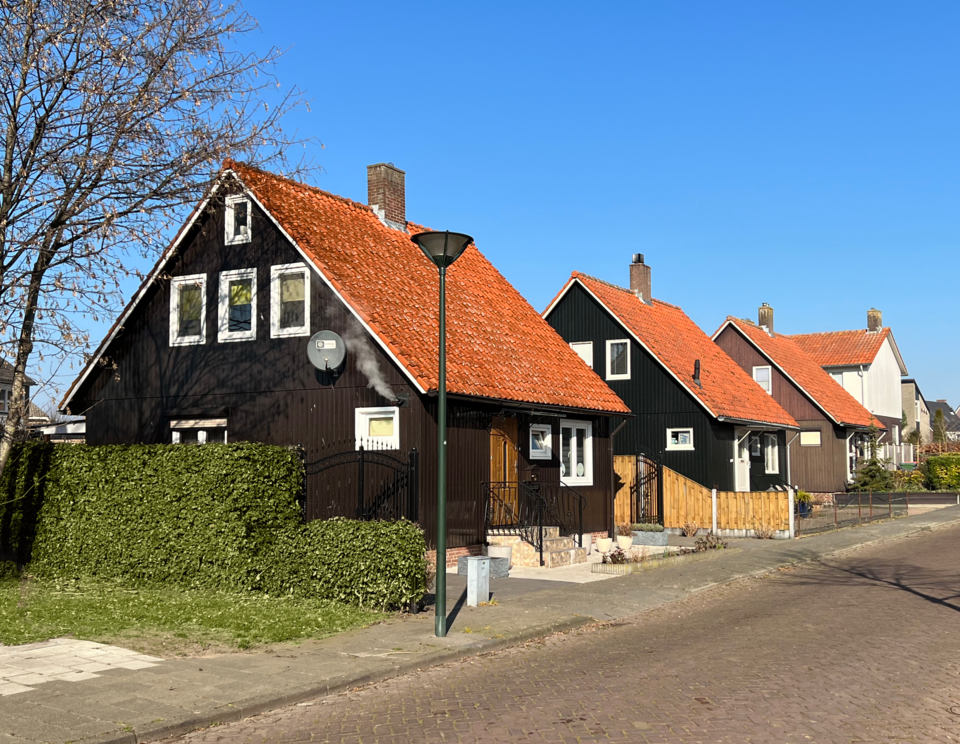 De woningen vallen op door hun steile dak van 53 graden en hun rode dakpannen. - Knik