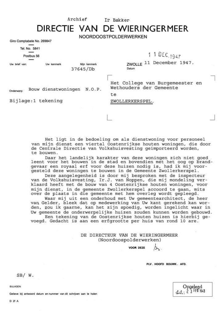 1948 – Behalve over bedrijfsgebouwen dienen de pachters ook over een eigen woning te beschikken en, voor de bedrijven groter dan 21 ha, over een woning voor de vaste arbeider. Van het aanvankelijke voornemen de pachters in de in aanbouw zijnde stenen dubbele arbeiderswoningen te huisvesten, is men teruggkomen, toen de gelegenheid zich voordeed houten, z.g. Oostenrijkse, woningen te plaatsen. Op 73 bedrijven komt nu een dergelijk huis, zodat, wanneer dit bouwplan is voltooid, alle pachters over een eigen woning en zo nodig over een woning voor de vaste arbeider zuilen beschikken. Inmiddels is wel gebleken, dat het verpachten van bedrijven, waarop de noodzakelijke gebouwen nog niet staan, vele moeilijkheden medebrengt, zowel voor de Directie als voor de pachters.