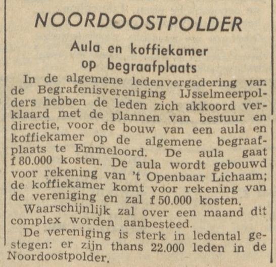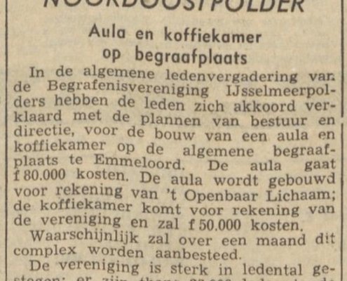 In de zomer van 1957 stemden de leden van de Begrafenisvereniging IJsselmeerpolders tijdens een ledenbijeenkomst in met de voorstellen van het bestuur en de Directie Wieringermeer om op de algemene begraafplaats voorzieningen te realiseren voor rouwdiensten en ontvangst.