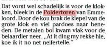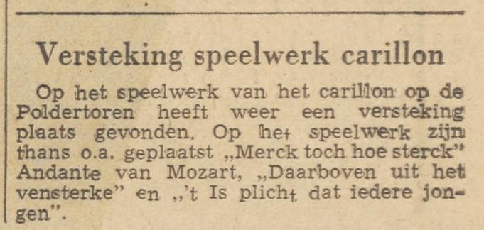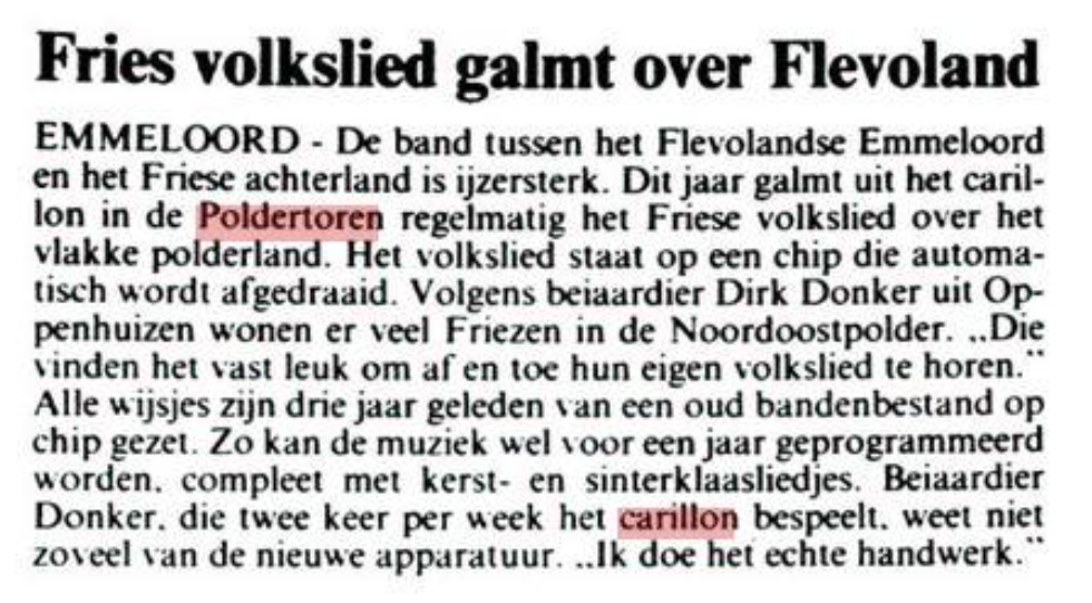 ‘Het gaat niet altijd en overal goed. Ooit dreigde hij (Dirk S.. Donker) het slachtoffer te worden van een vallende klepel, 80 kilo zwaar, die uit het klokkenspel van de poldertoren in Emmeloord donderde. Gelukkig lag het beiaardiersdak nog tussen het brok ijzer en het hoofd van Donker in, zodat hij met de schrik vrij kwam. ‘