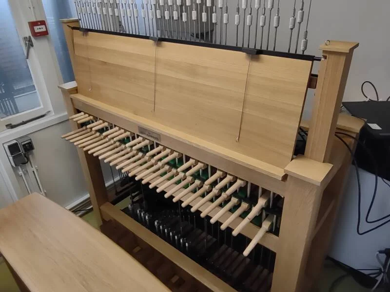 De stokken van het klavier zijn met kabels verbonden met de klepel van de klok.