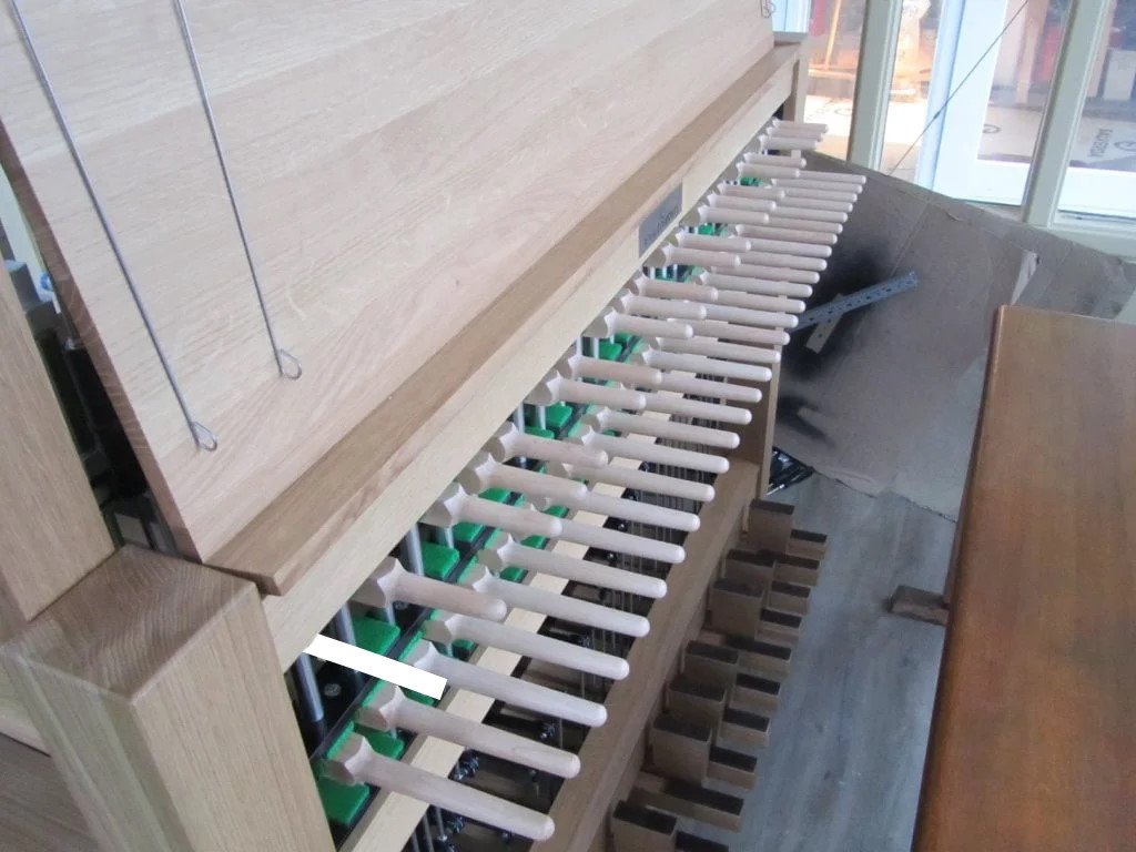 De kabels van de pedalen zijn verbonden met die van de toetsen op het klavier. De lage tonen kunnen dus zowel gespeeld worden vanaf het klavier als de pedalen. Ze trekken aan dezelfde kabel ! Als een pedaal wordt ingedrukt, zie je ook de stok op het klavier zakken.