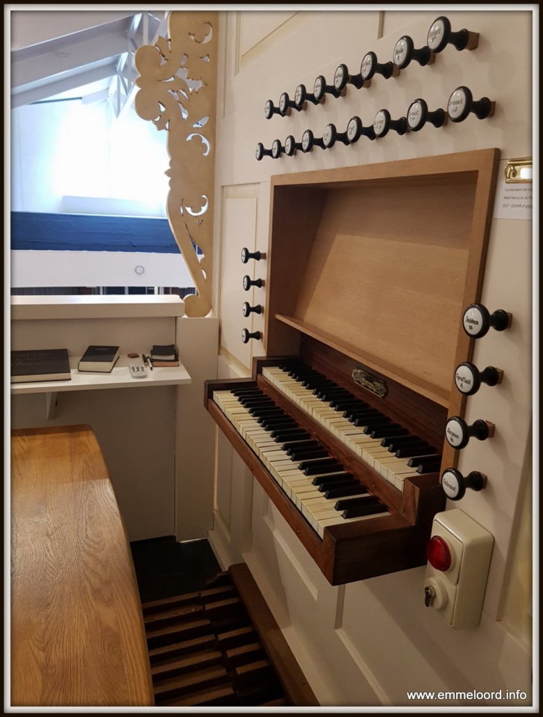 Bovenwerk: Salicionaal 8′, Bourdon 8′, Viola di Gamba 8′, Gemshoorn 4′, Roerfluit 4′, Quintfluit 3′, Picolo 2′, Clarinet 8′, Tremulant.