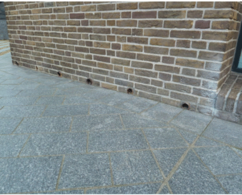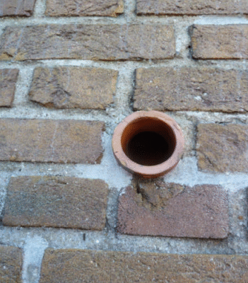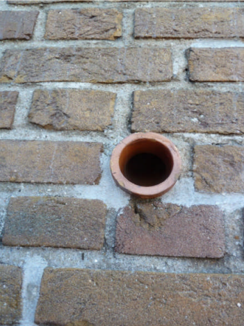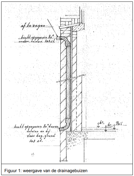 Onderzoeksrapport gevel- en daklekkages Nieman-Kettlitz 2012: In de gevel is sprake van een soort drainagesysteem. Dit systeem is waarschijnlijk bedoeld om doorslagwater in het steens buitenblad (dus niet de spouw) af te voeren. Deze drainagebuizen eindigen op verschillende plekken in e gevel. Doordat al deze buizen open staan is zowel ontwatering als inwatering mogelijk. Het hydrofoberen heeft dus niet zoveel zin gehad. Immers, de buizen staan open. (bron: pdf)