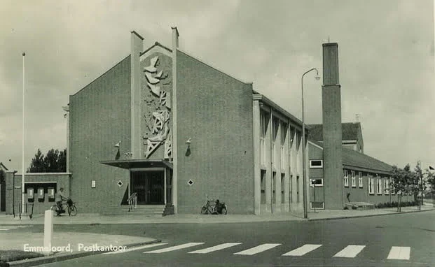 De bestellingen in de Polder zijn extra zwaar, een route van 100 km is heel normaal hier. Sommige routes zijn 140 km lang en vanuit den Haag had hij hierover wel eens ongelovige opmerkingen gehoord. Maar toch zal het corps bestellers hier straks moeten worden uitgebreid tot dertig man.De heer A. Zoutewelle, beheerder van het nieuwe bijkantoor te Emmeloord, sprak de dank uit over het vertrouwen, dat de directie der P.T.T. in hem stelde en hij hoopte zijn superieuren nooit teleur te stellen. Nog enkele sprekers voerden het woord,waaronder afgevaardigden van het bedrijfsleven in de N.O.P. en de aannemers, firma Fróhlig van Harlingen.Het nieuwe kantoor is een hoog hal-vormig gebouw, mét in de voorgevel een versiering van uitspringende bakstenen. De lijnen van het exterieur zijn sober en strak, maar inwendig is de afwerking iets meer luxueus. De rij loketten is flink groot en er is nog mogelijkheid van uitbreiding, zodat de dienst straks vlot zal kunnen verlopen.