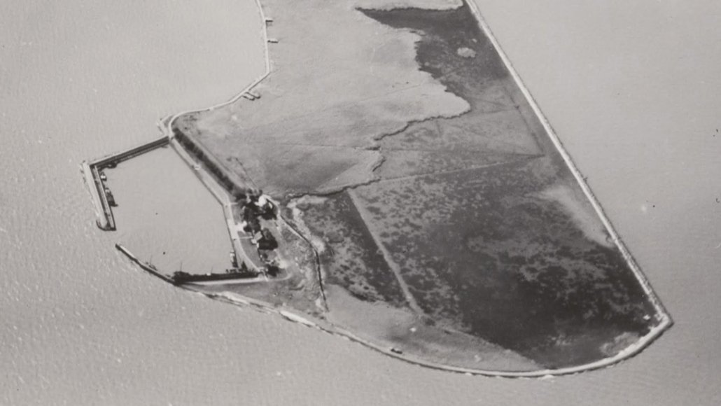 Zo kwam het verdronken eiland weer boven water en treffen de polderwerkers het eiland aan.