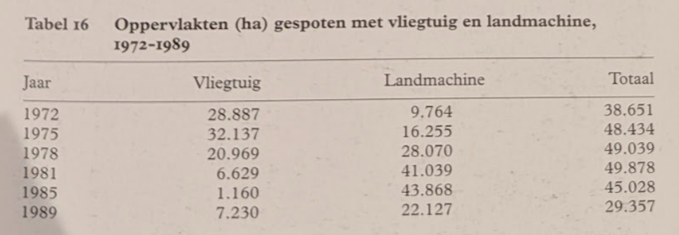 Na goede ervaringen in de jaren zestig werd in de eerste helft van de jaren zeventig voor de rietbestrijding in Zuidelijk Flevoland en voor de gewasbescherming veelvuldig gebruik gemaakt van het spuitvliegtuig (zie tabel 16). Die inzet had niet alleen te maken met de zeer grote oppervlakten die in korte tijd moesten worden bespoten, maar ook met een aantal voordelen die het vliegtuig boven de landmachine had. Zo was er bij vliegtuigspuiten minder vloeistof per ha nodig en konden grotere percelen zonder bijtanken van bestrijdingsmiddelen worden afgewerkt. Bovendien maakte een vliegtuig geen rijspoor in het gewas en kon onbegaanbaar terrein zonder problemen worden bespoten. Ook waren de kosten per ha waren lager dan bij bespuiting met een landmachine.
